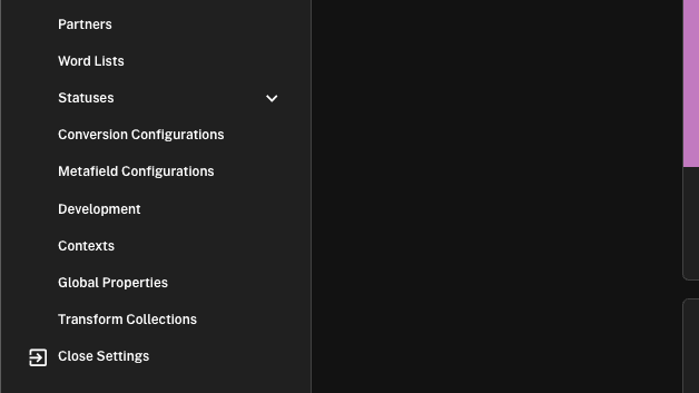 Here you will now find metafield settings, conversion configurations, profanity or other lists of words to use within the platform, global settings and more.